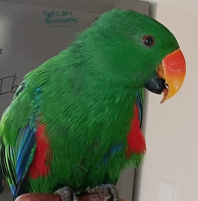 Meet Zeus - Bright, intelligent, and stunning to look at — the Eclectus Parrot is one of the most striking pet parrots in New Zealand. Known for their vivid colours and calm, thoughtful nature, they make loyal companions who love attention and gentle interaction.